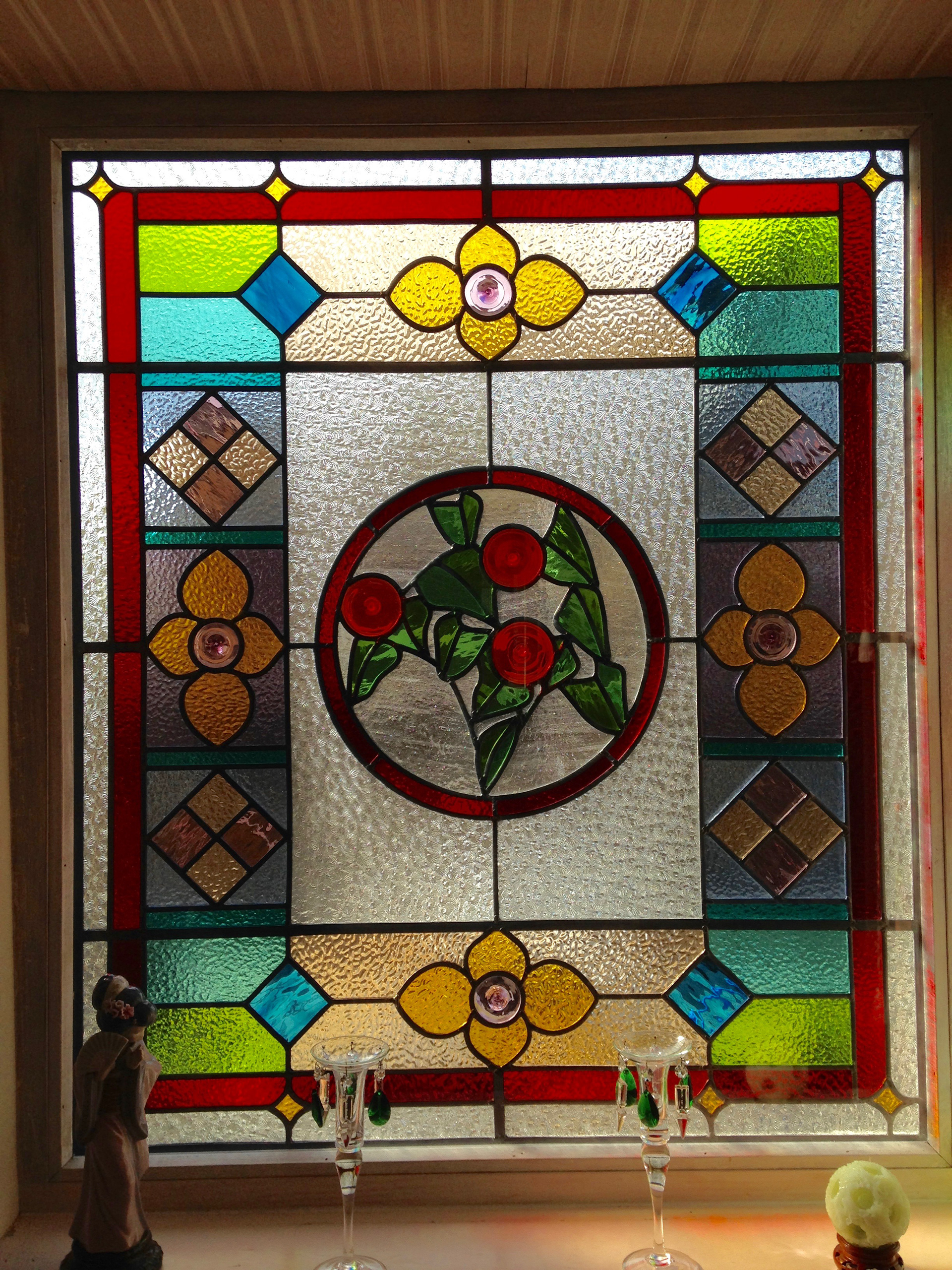 This commissioned piece of traditionally made Stained Glass was designed to encompass existing source victorian style artwork found elsewhere in the building. Similarly colours and textures were chosen to match. Hand blown glass roundels were used for the flower sections and clear flemish glass for the background. The panel was encapsulated within double glazing to protect it from strong winds on the unsheltered side of the building.