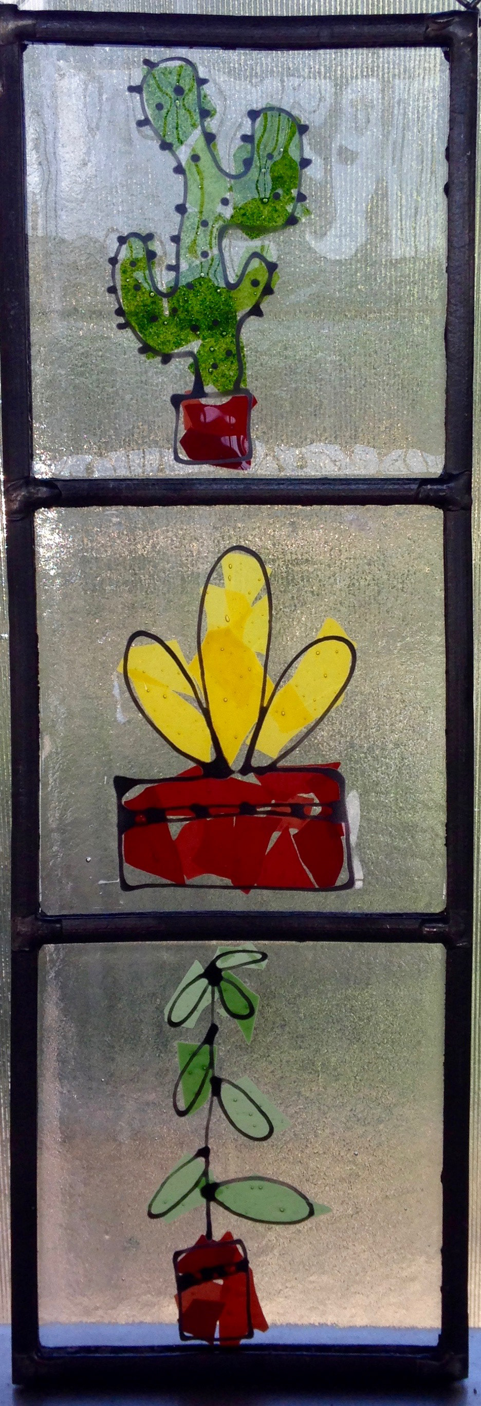 Fused Glass tiles, which individually range in size up to 30x30 cm, set into traditional lead came panels to make compound art works. These can either hang or be made to fit frames with a variety of variations - just ask on the 'Ordering a Commission' page or contact me directly for more information.