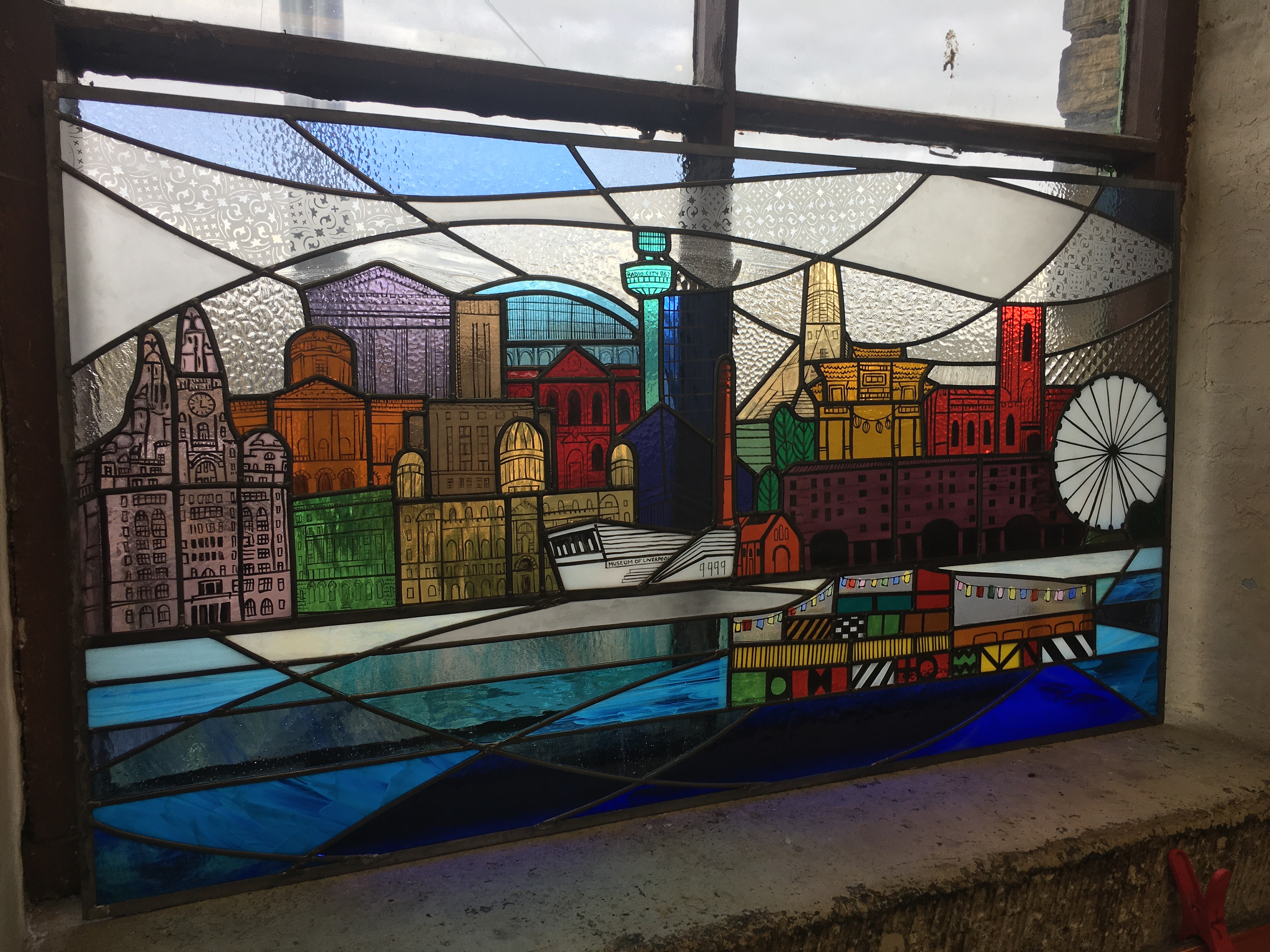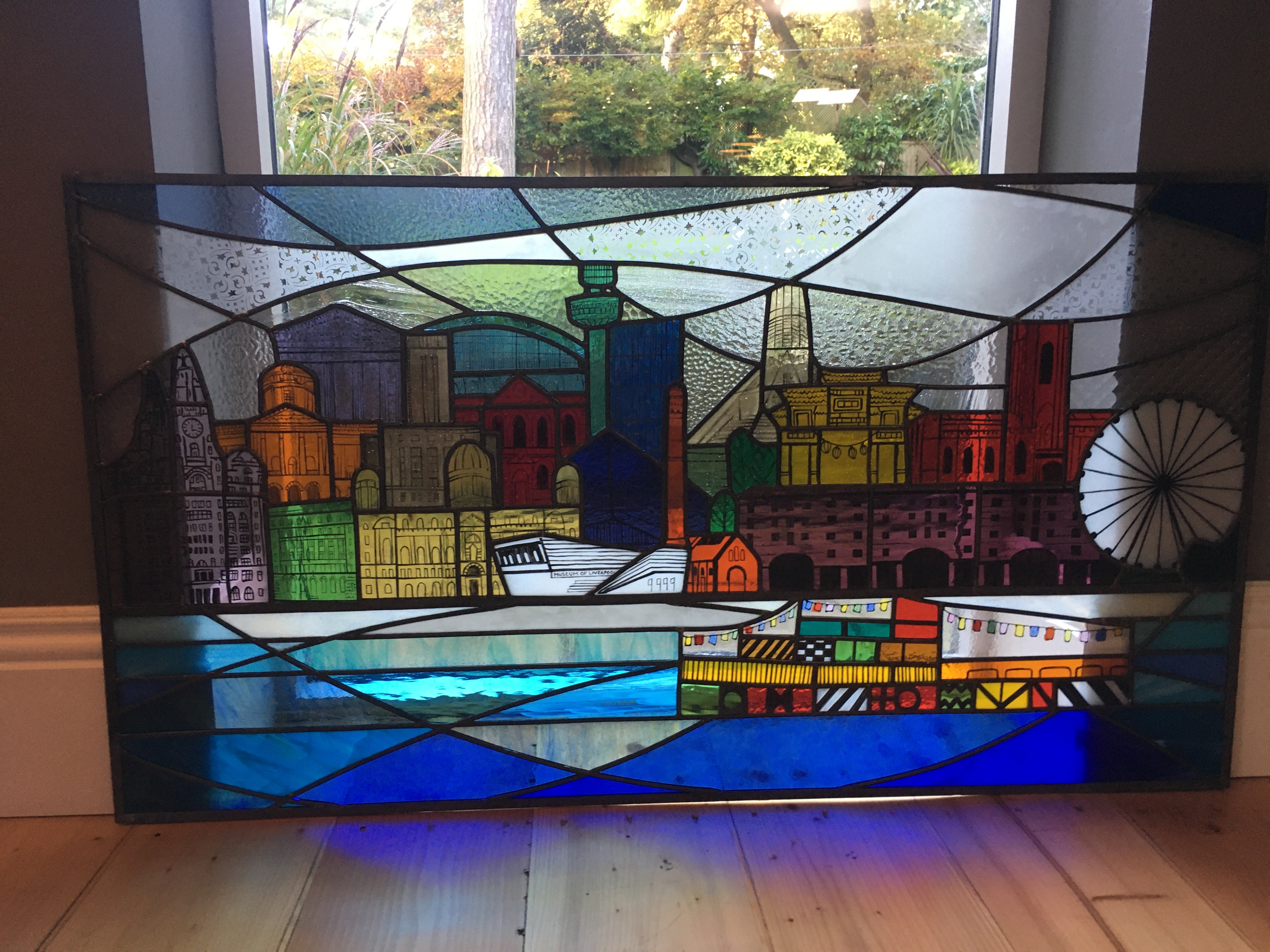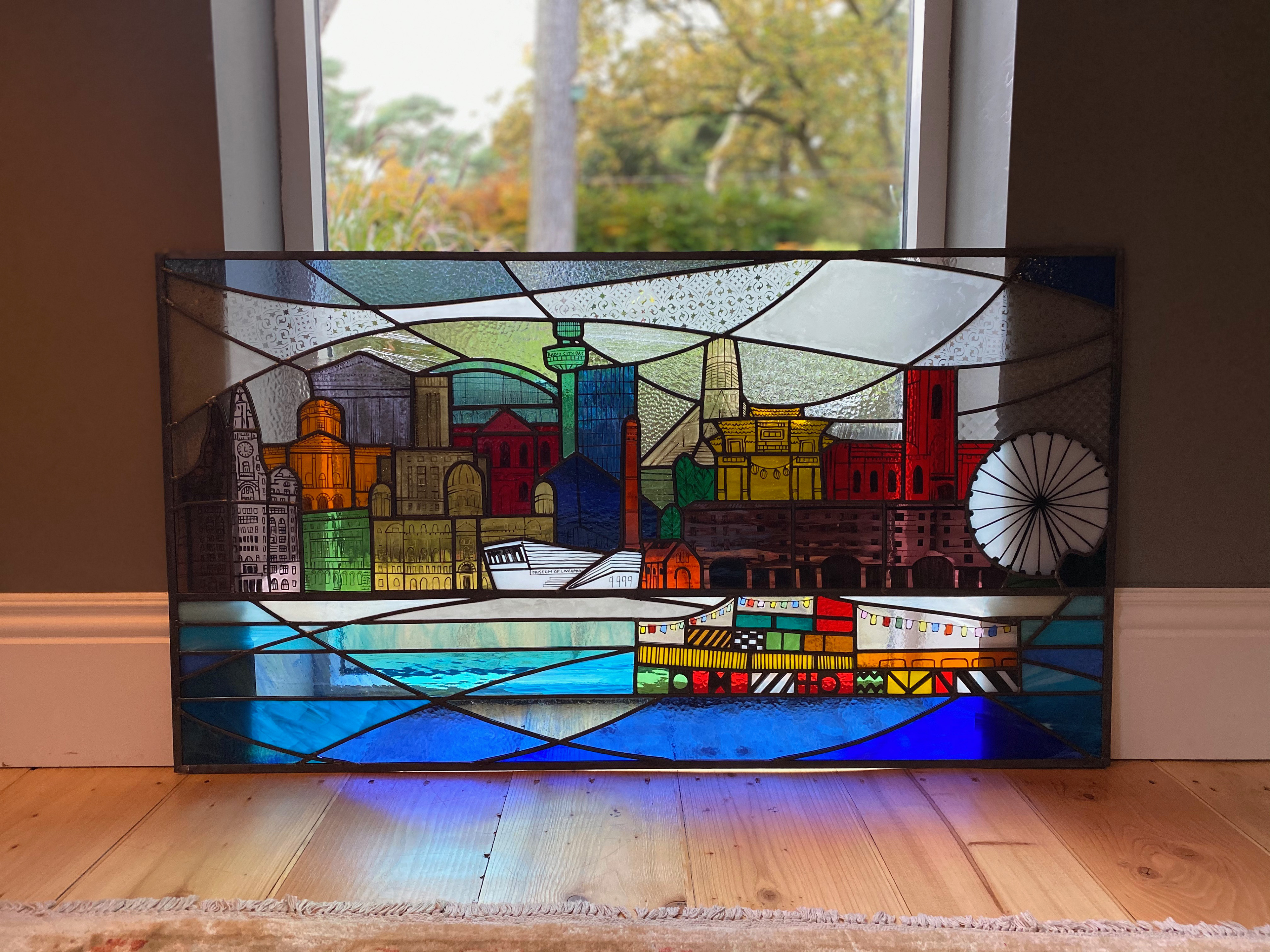 A stained glass panel dipicting Liverpool waterfront. This piece was designed and made for episode 3 of BBC1 show Home Is Where The Art Is, which aired in July 2020.