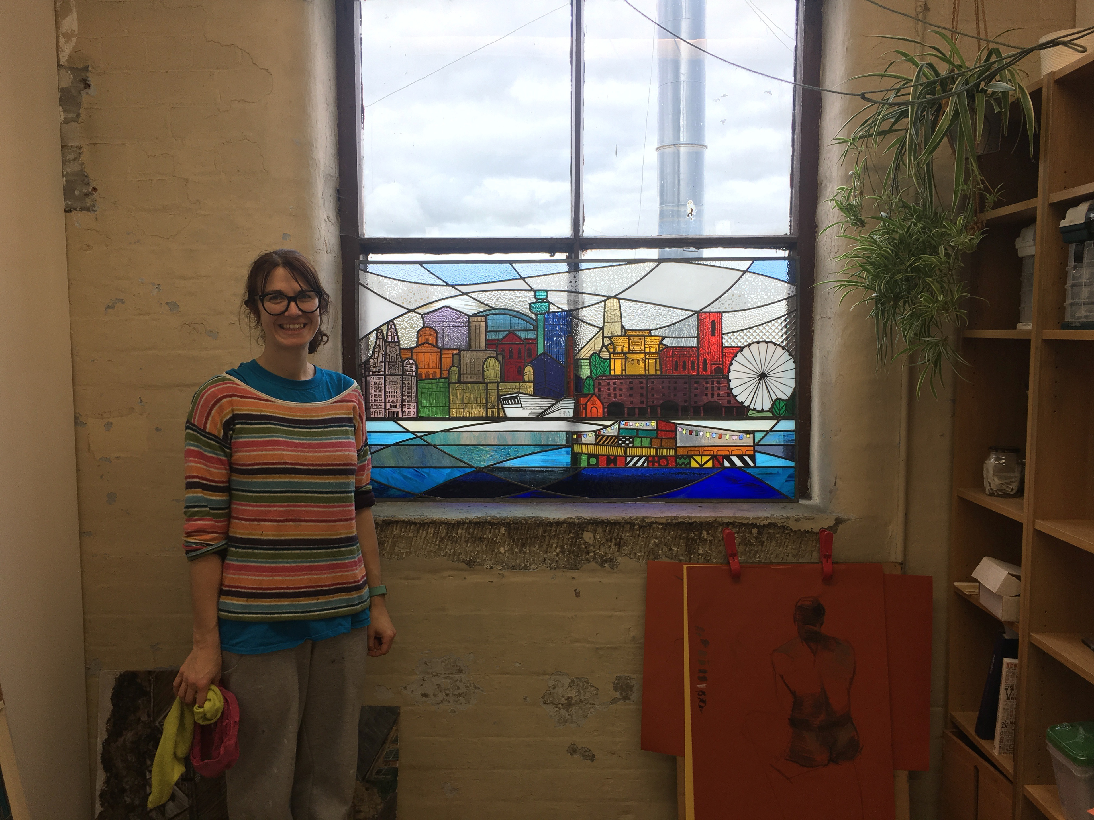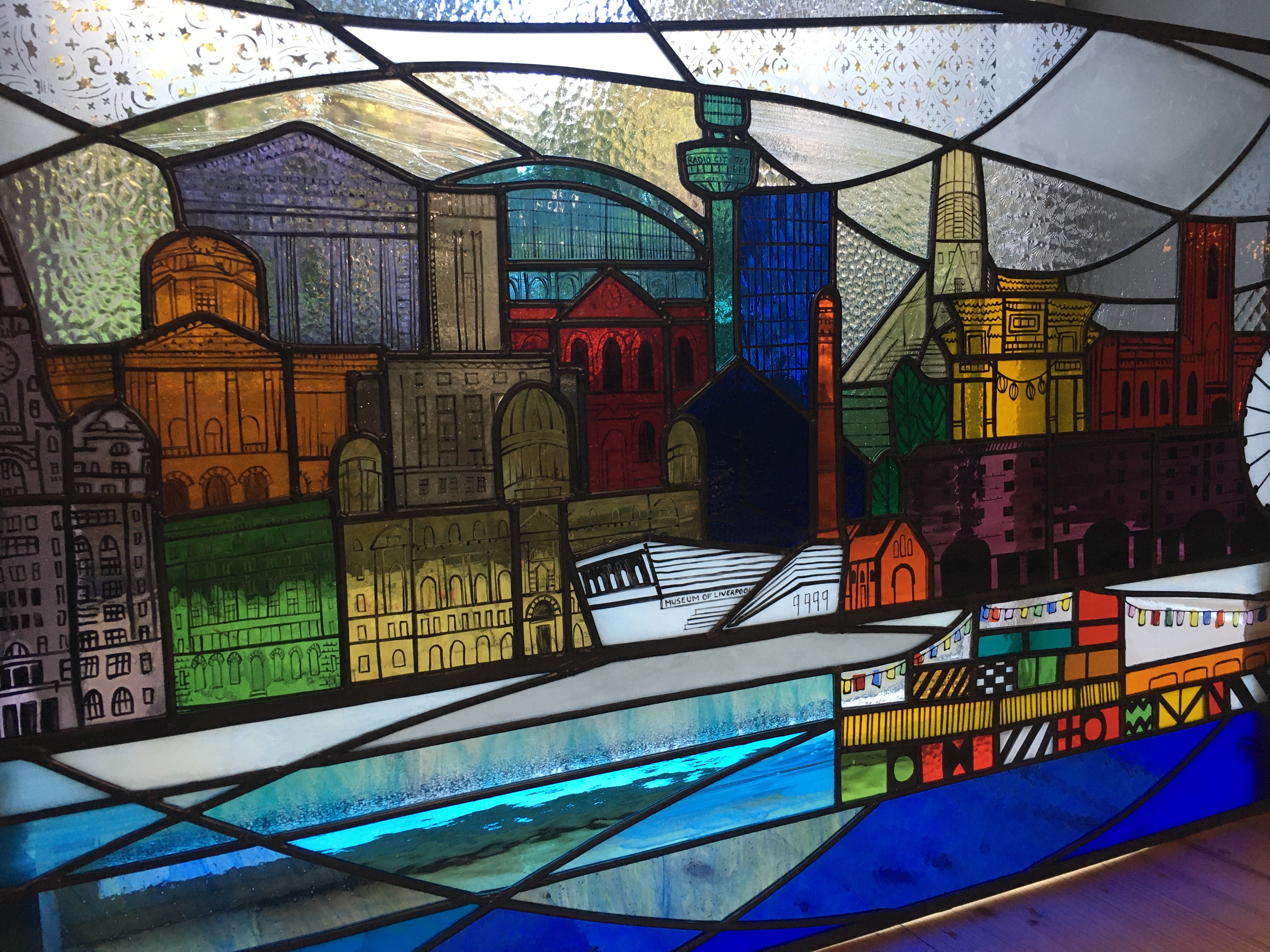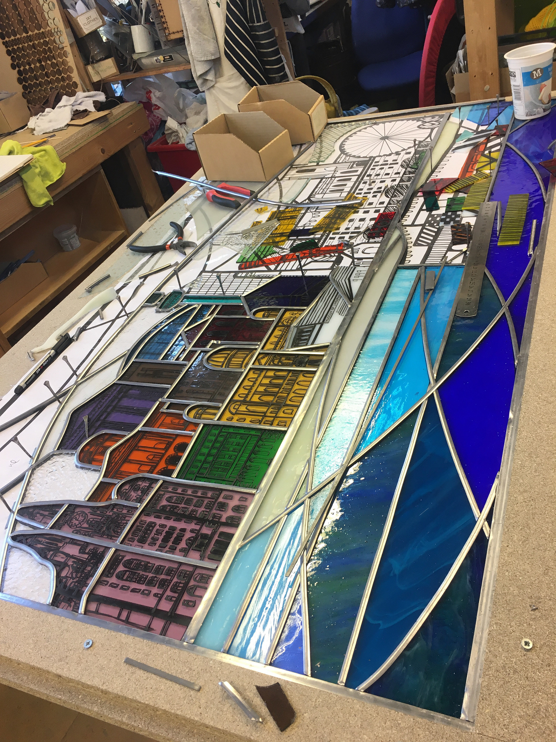 A stained glass panel dipicting Liverpool waterfront. This piece was designed and made for episode 3 of BBC1 show Home Is Where The Art Is, which aired in July 2020.